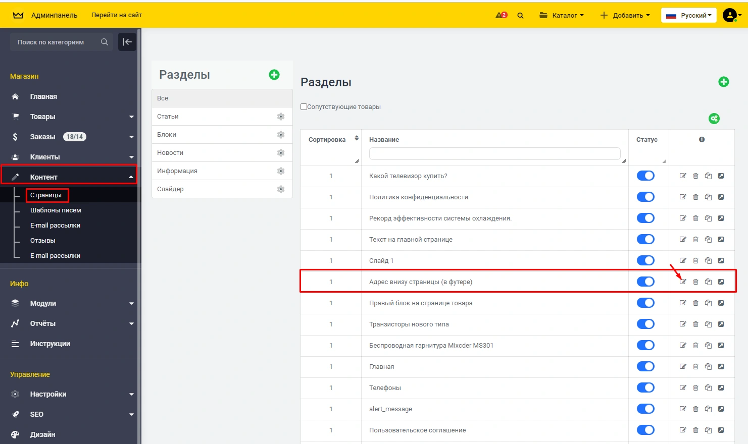 производиться через панель администрирования: «Контент» -> «Страницы»
