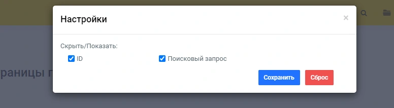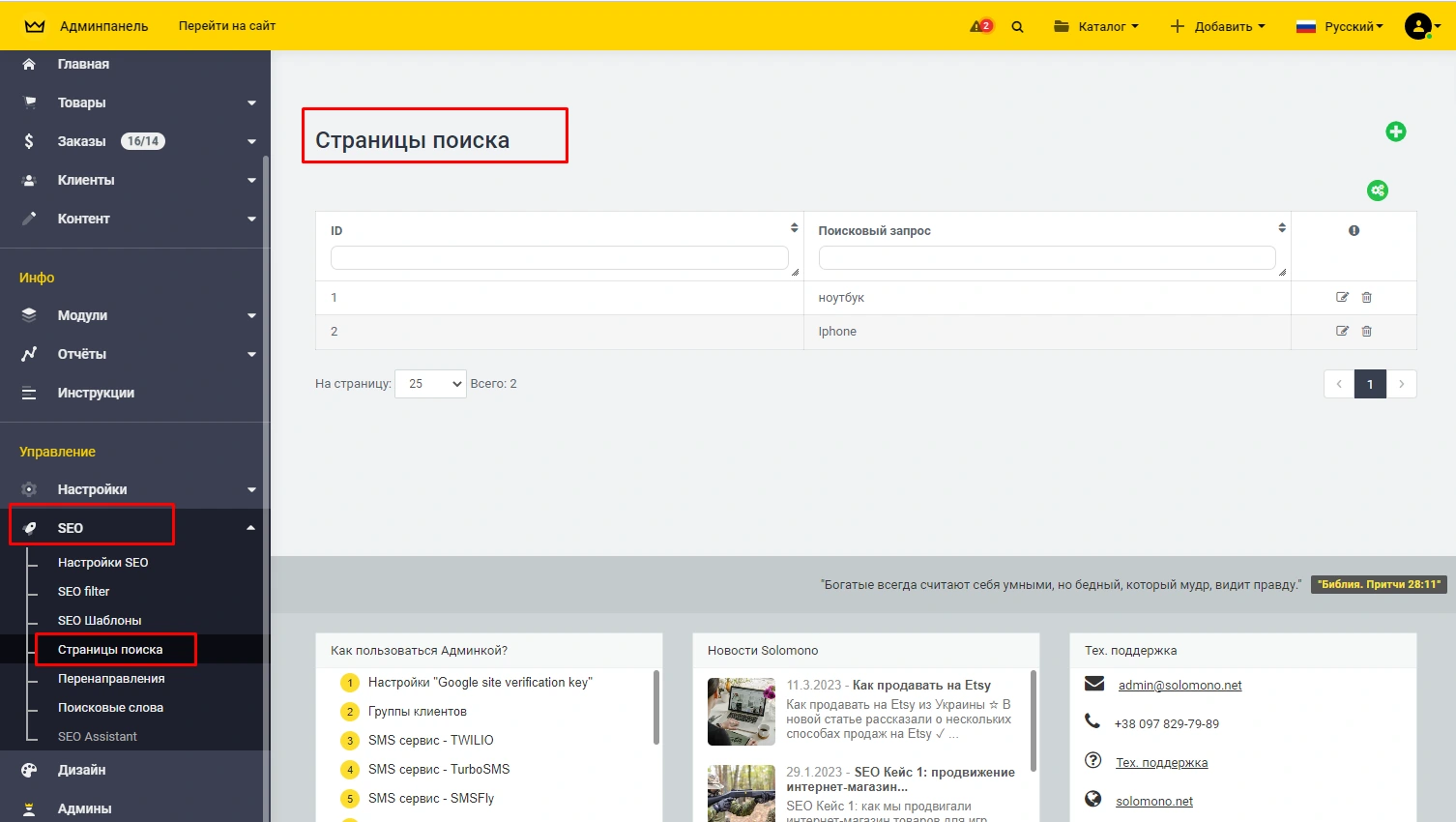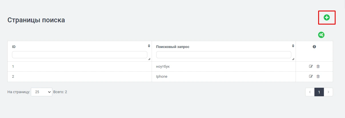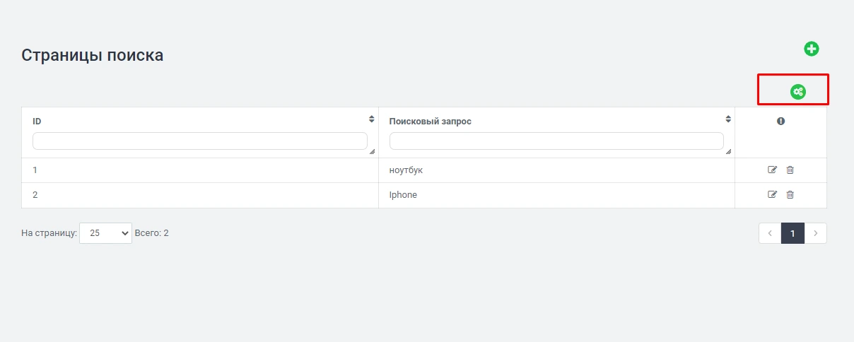 Чтобы настроить поисковые запросы, нужно зайти в панель администрирования в раздел SEO -> Страницы поиска -> нажать на иконку “Настройки”: