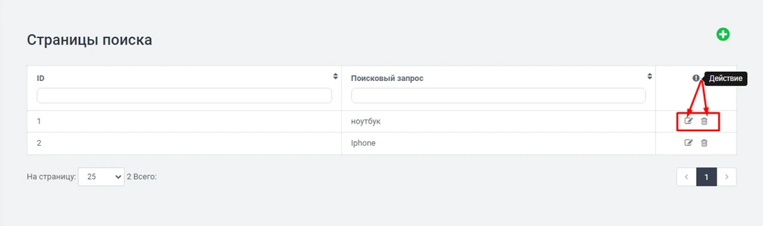 У Вас так же есть возможность редактировать или удалять созданные результаты для поиска, в колонке «Действие»: