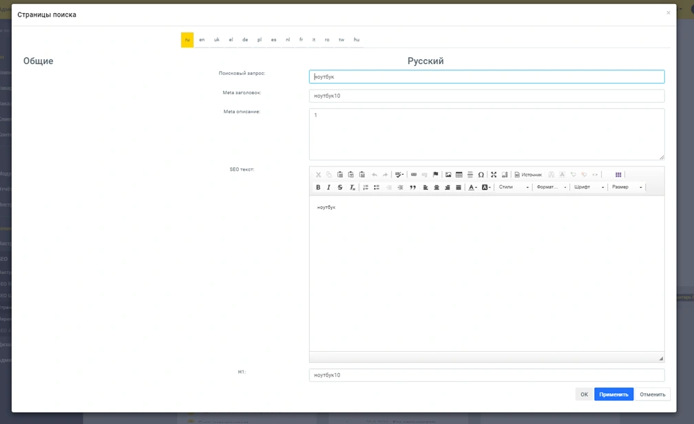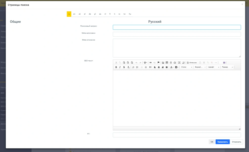 В новом окне заполнить необходимые поля: Поисковый запрос, Meta заголовок, SEO текст, H1 и нажать кнопку «Применить».