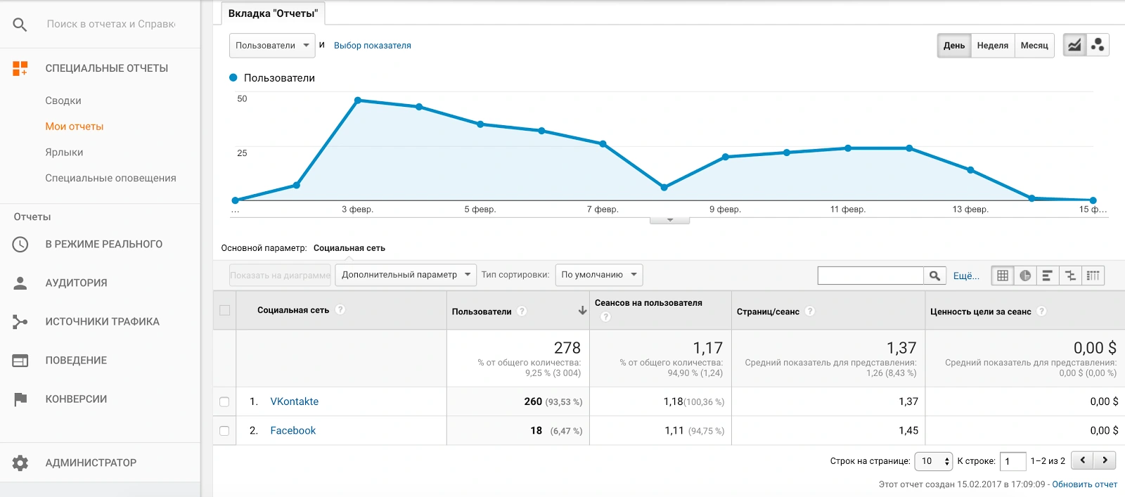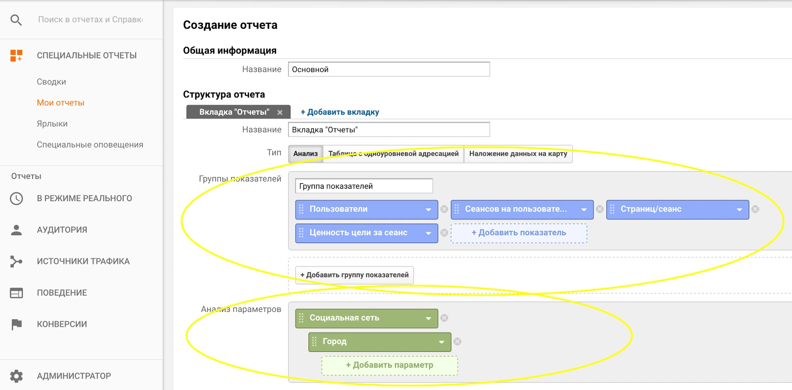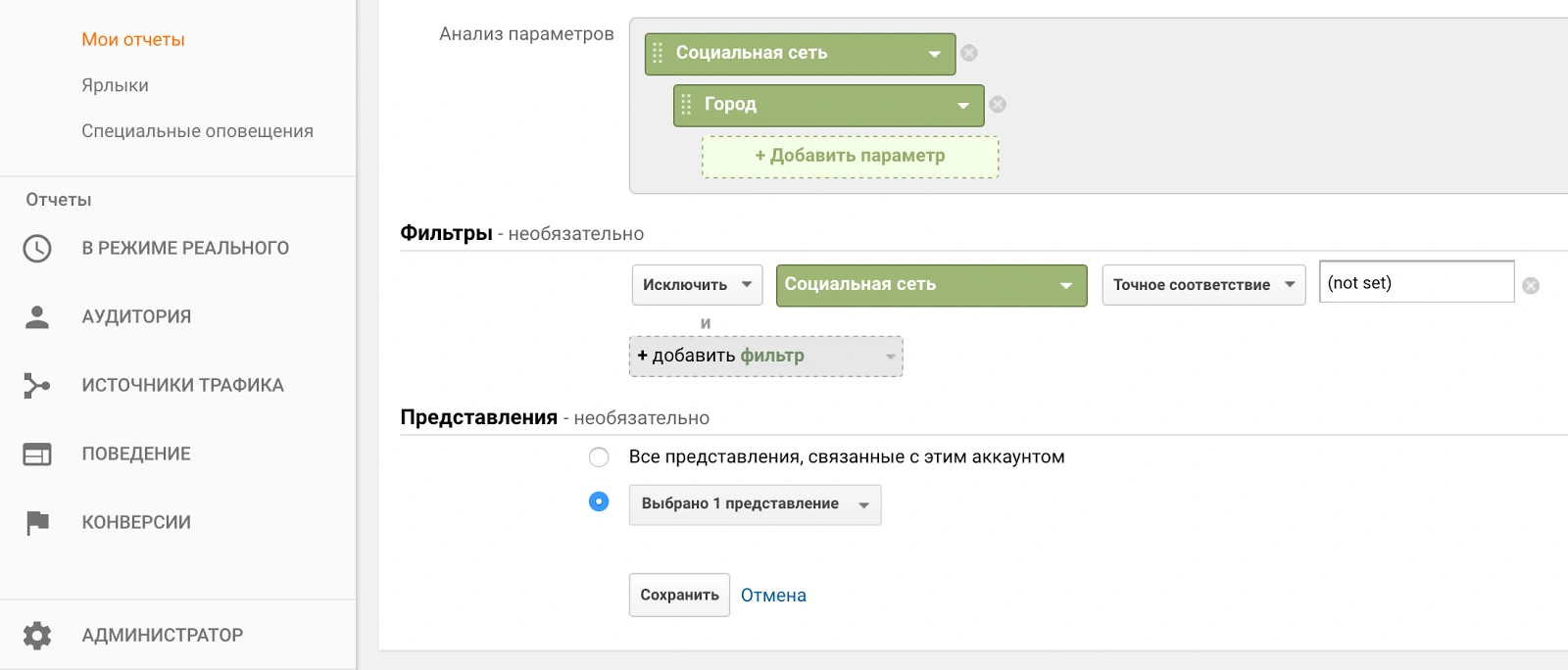 Примером будет отчет о пользователях, пришедших из социальных сетей. Ниже мы создадим и другие отчеты, но первые шаги будут продемонстрированы на этом варианте.