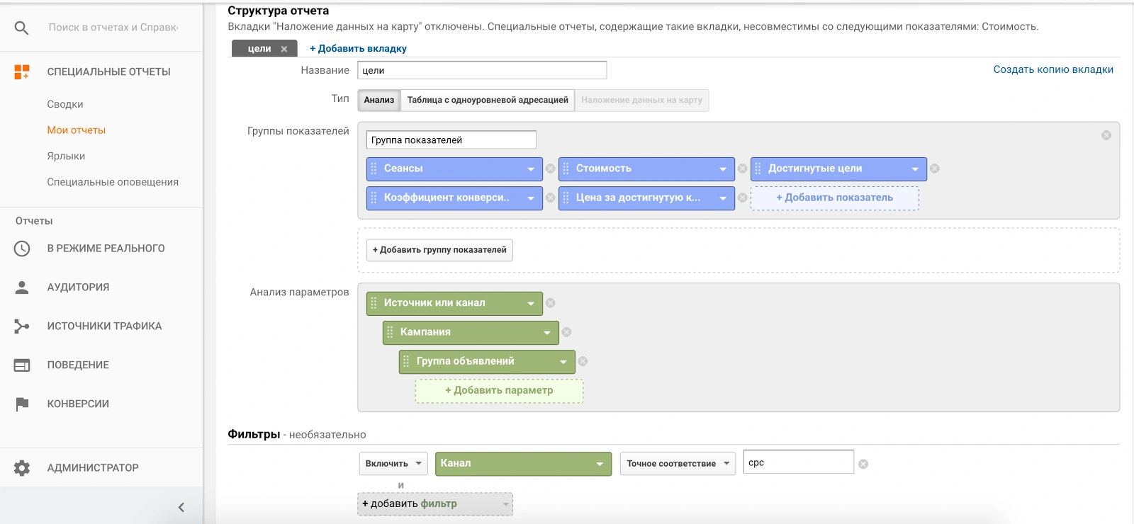 По подобию предыдущего создадим отчет «Эффективность cpc».