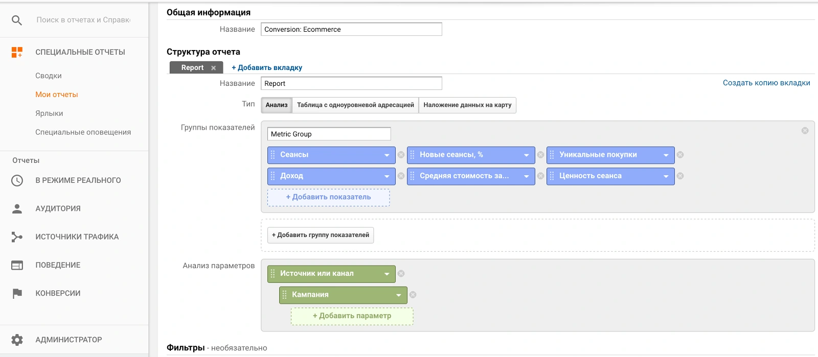 Начнем с самого важного – отчеты. Чтобы анализировать данные в Google Analytics, нужно понимать, какие данные мы можем получить из отчетов. Это означает, что прямо сейчас мы создадим свой персональный отчет и разберем параметры.