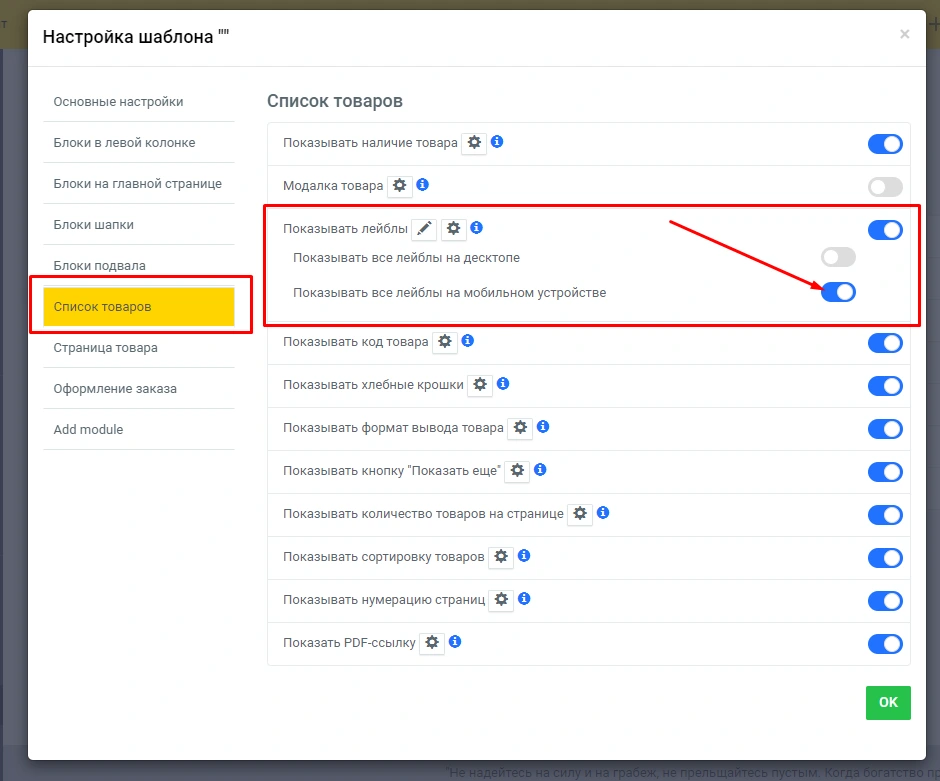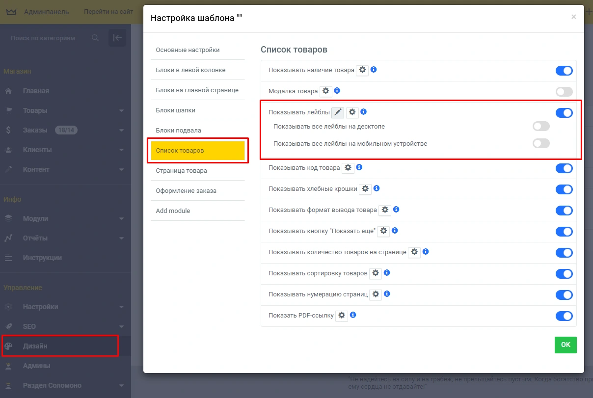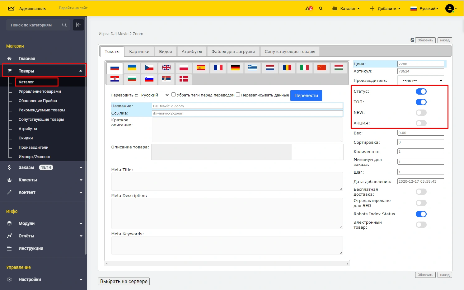 Чтобы пометить лейблами те или иные позиции в каталоге интернет-магазина, нужно перейти к панели управления и выбрать пункт меню «Товары» -> «Каталог», нажать на необходимый товар и там можно вручную включить лейбл товара: