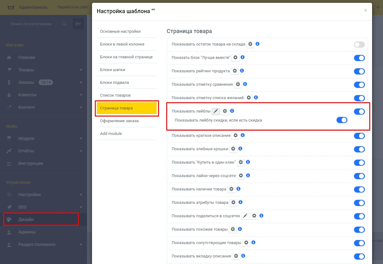 В админ-панели в разделе «Дизайн» -> «Настройка шаблона» -> «Страница товара», можно настроить следующие опции: