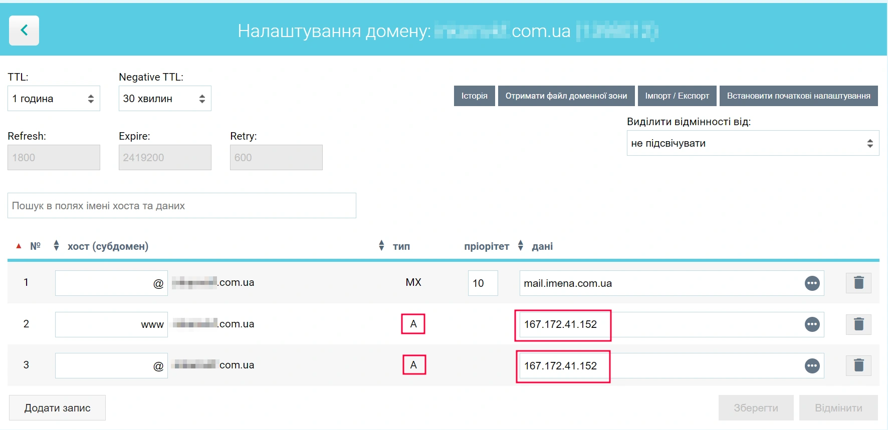 Обратите внимание! Старые A записи, а также AAAA записи, нужно удалить, если таковые имеются.