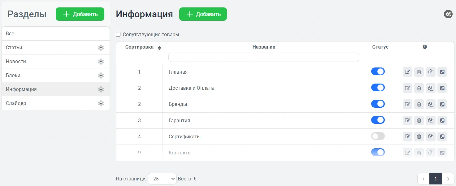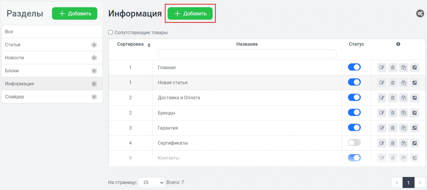 Теперь перейдем к этому разделу статей - "Контент" - "Страницы" - "Информация". Здесь настраивается содержание статей и то, будут ли они отображаться в магазине.
