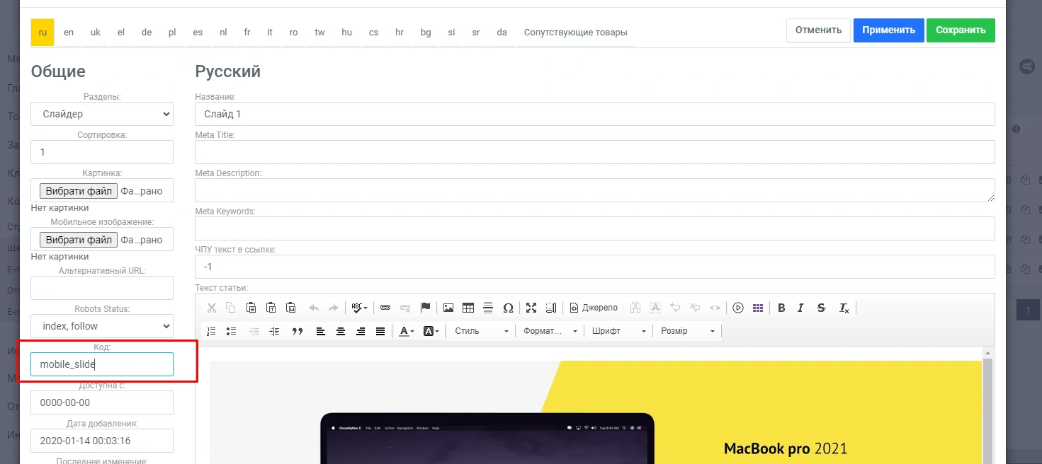 Важно! Если Вы добавляете картинку для мобильной версии, то для правильного отображения картинки в слайдере на разных языках, в блоке "Код" нужно прописать - "mobile_slide".
