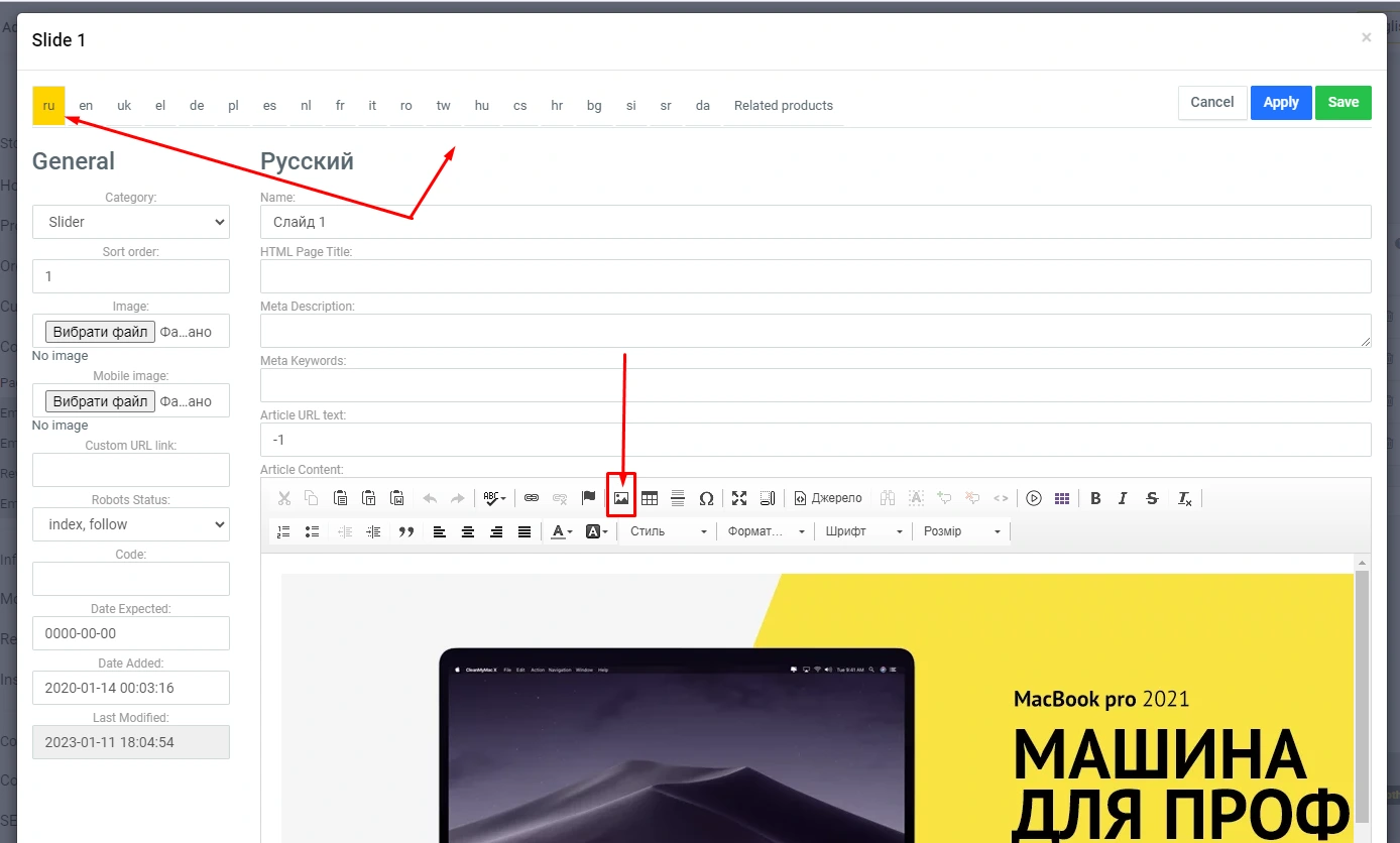 Чтобы разместить слайды для мобильной версии сайта, то на всех доступных языках Вашего сайта, нужно загрузить картинку через иконку "Изображение":