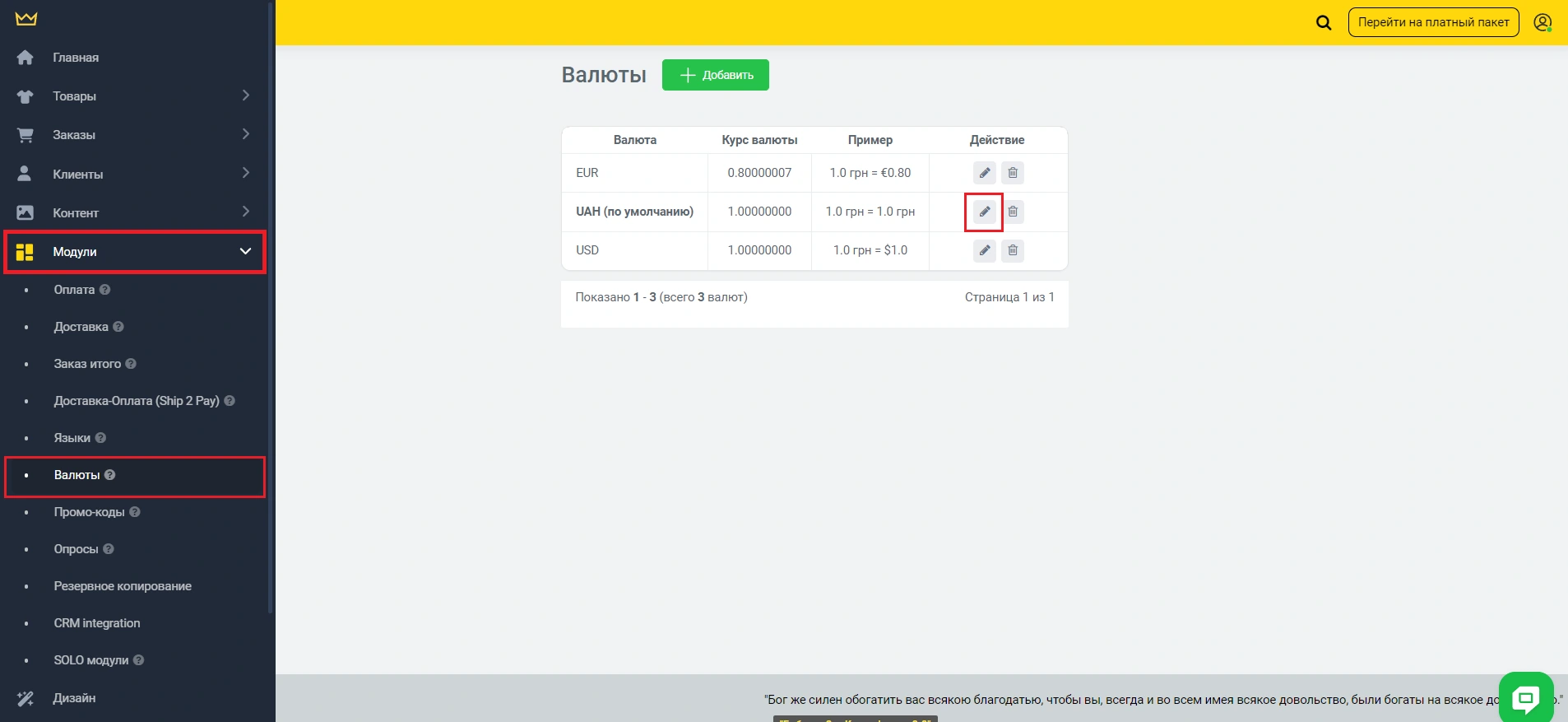 Настроить вывод знаков после запятой можно в настройках валют. Перейдите на страницу "Модули" -> "Валюты" и зайдите в меню редактирования:
