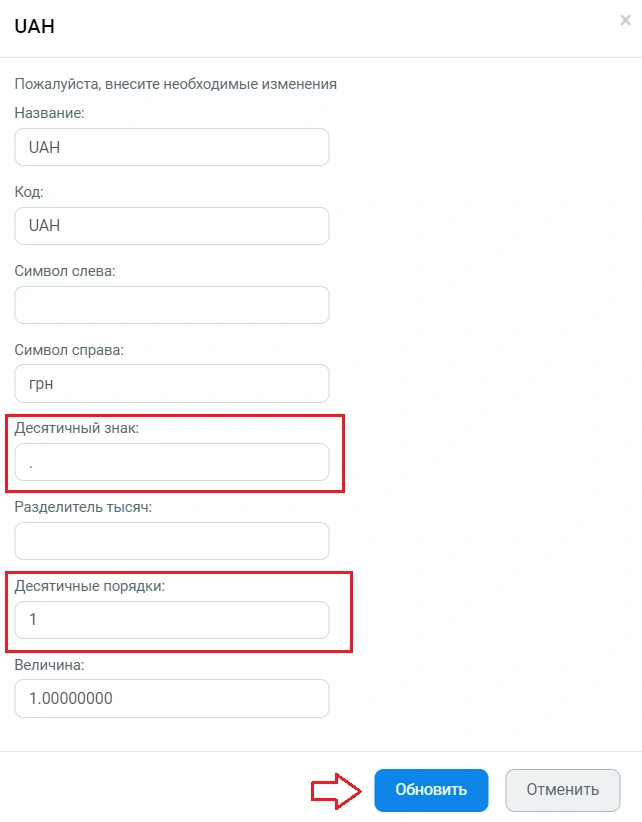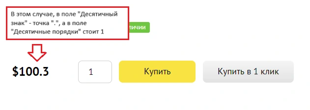 В поле "Десятичные порядки" укажите количество цифр после запятой, которое вы хотите видеть в ценах на вашем сайте. Например, если цена 100,25 грн., и вы укажете один десятичный разряд, то увидите 100,3 грн. - одна цифра после запятой, произошло округление до десятых.