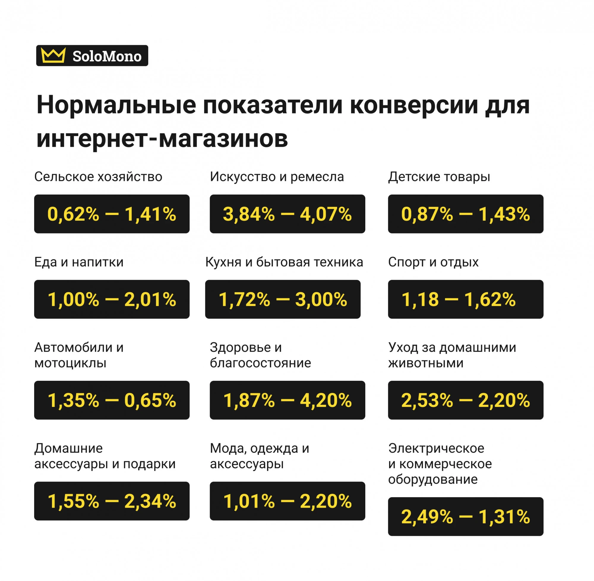 В целом нормальной конверсией для электронной коммерции считаются показатели от 1% до 5%. В частности, одно из последних исследований приводит такие данные.