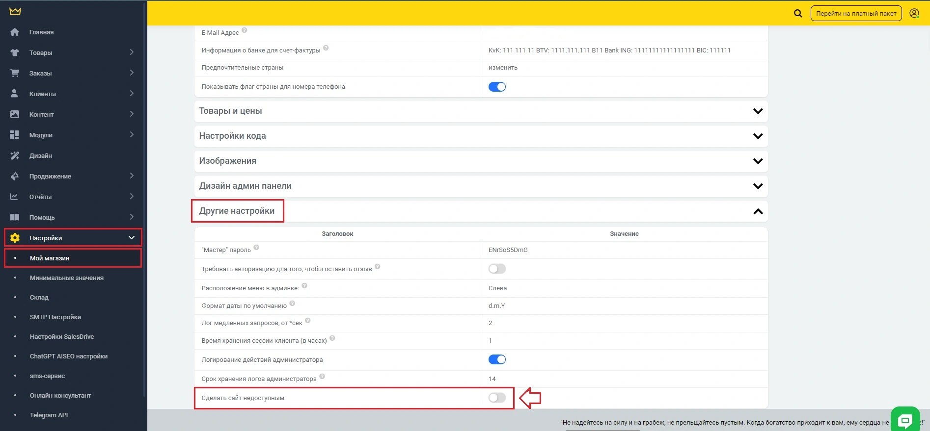 Если вам необходимо временно закрыть сайт от пользователей на технические работы, вы легко можете это сделать. Войдите в Админпанель вашего сайта и включите в Настройки - Мой Магазин - Другие настройки переключатель "Сделать сайт недоступным":