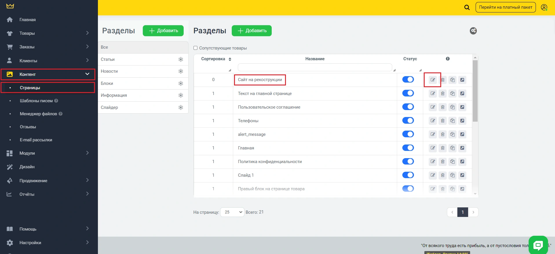 Также у Вас есть возможность отредактировать текст на изображении выше. Достаточно зайти в Контент - Страницы и отредактировать статью "Сайт на реконструкции":