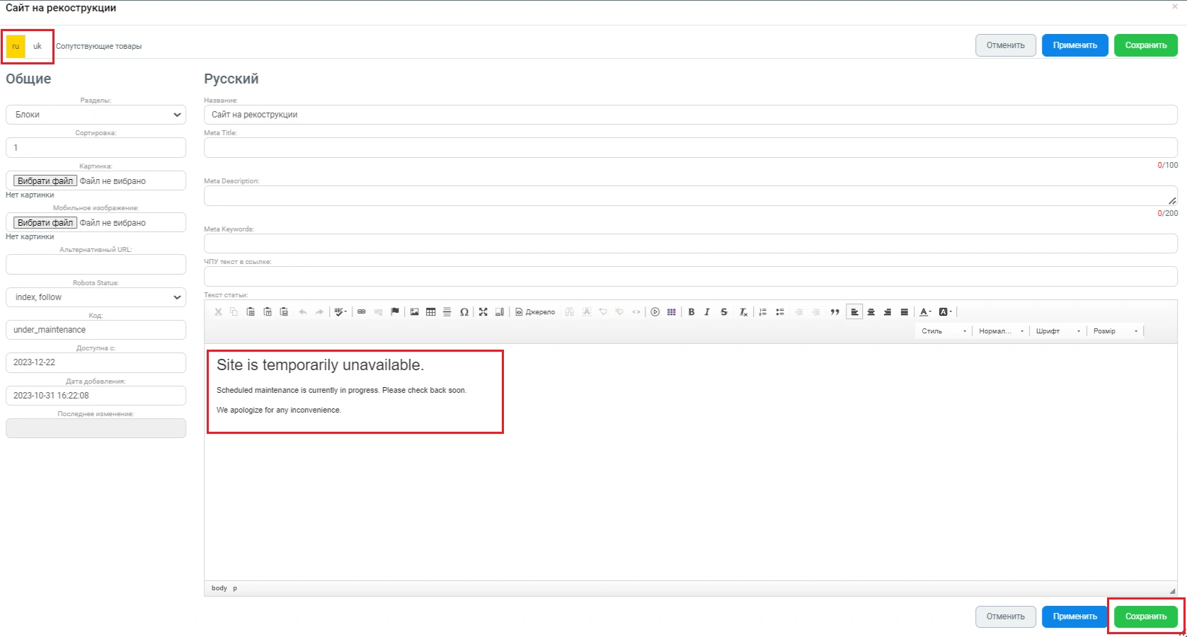 Заполните текст на всех языках, которые доступны на вашем сайте и нажмите Сохранить: