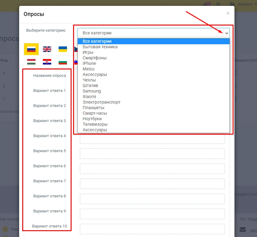 В новом окне, можна выбрать определенную котегорию для опросов, либо же оставить "Все категории", добавить варианты вопросов в том количестве которое Вам необходимо: