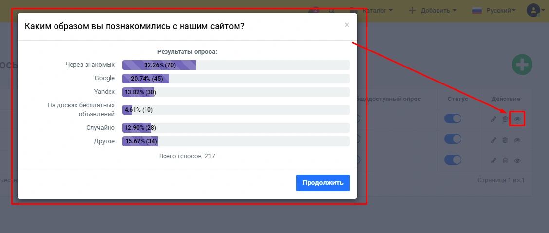При нажатии на иконку "Предпросмотр" - у Вас есть возможность просмотреть отчет с результатами голосов/ответов