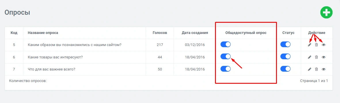 Также у Вас есть возможность редактировать действующий опрос или удалять уже ненужные строки. В колонке "Общедоступный опрос" Вы можете сделать доступным опрос для всех пользователей (статус - включен), либо только для зарегистрированых пользователей (статус - выключен)