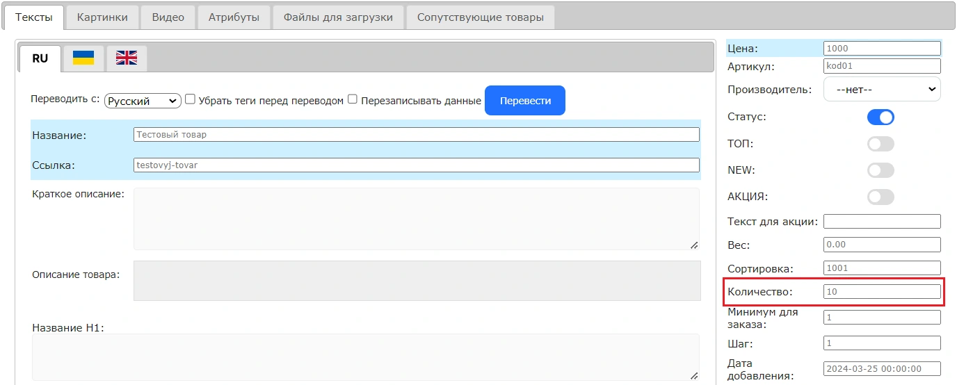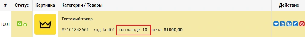 На странице каталога в списке товаров вы сможете видеть количество товаров на складе. В данном случае основное количество - это количество из вкладки "Тексты" (10).