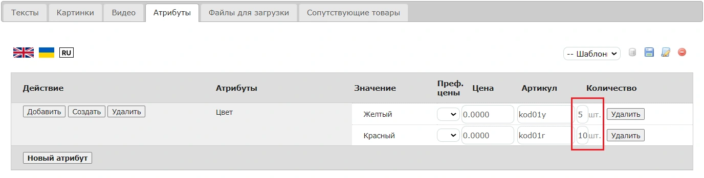 Если у вашего товара есть атрибуты, вы можете задать количество товара отдельно по атрибутам. Например, 10 товаров красного цвета и 5 желтого. В настройках склада есть возможность выбрать, какое количество будет считаться основным - то, что указано во вкладке "Тексты" или сумма количеств во вкладке "Атрибуты", если ваш атрибут имеет тип, позволяющий переключаться между его значениями.