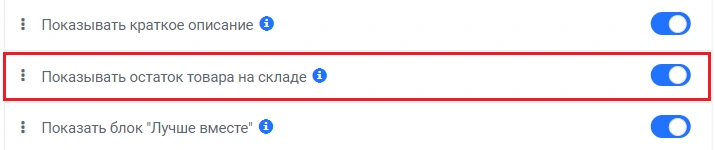 Если этот переключатель включен, на странице товара на метке "В наличии" клиенты смогут видеть количество товара.