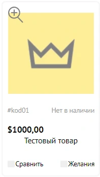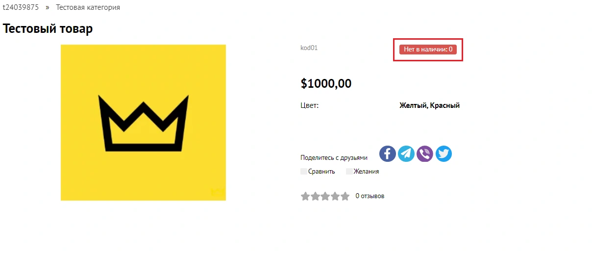 Если товара на складе нет, то метка "В наличии" будет изменена на "Нет в наличии". Кроме того, по умолчанию кнопка "Купить" у товара, которого нет на складе, не выводится.