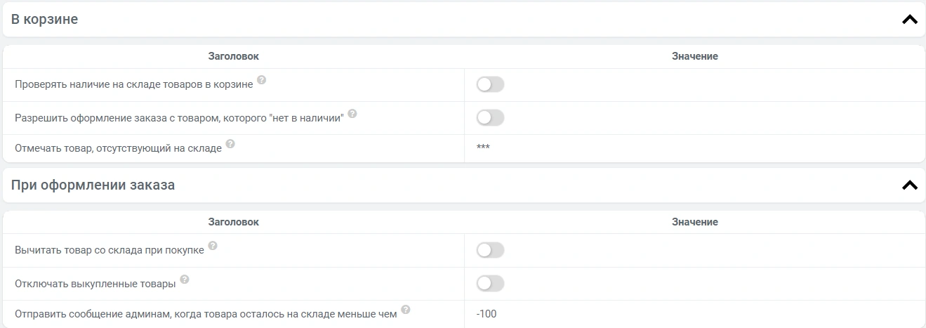 Вычитать товар со склада при покупке - если переключатель включен, то при оформлении заказа автоматически будет вычитаться количество купленного товара из остатка на складе.