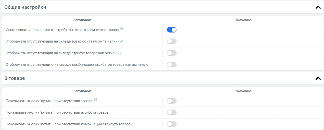 Отображать отсутствующий на складе атрибут товара как активный - если товара по определенному значению атрибута нет в наличии, то, включив этот переключатель, вы все равно сможете выбрать это значение на странице товара.