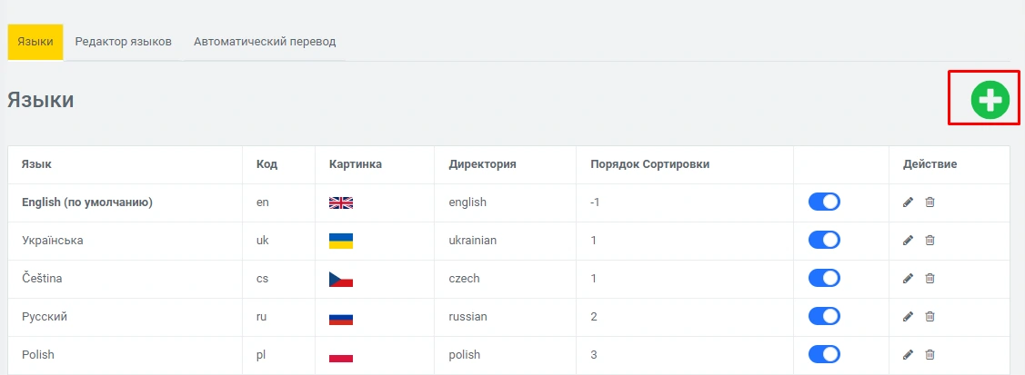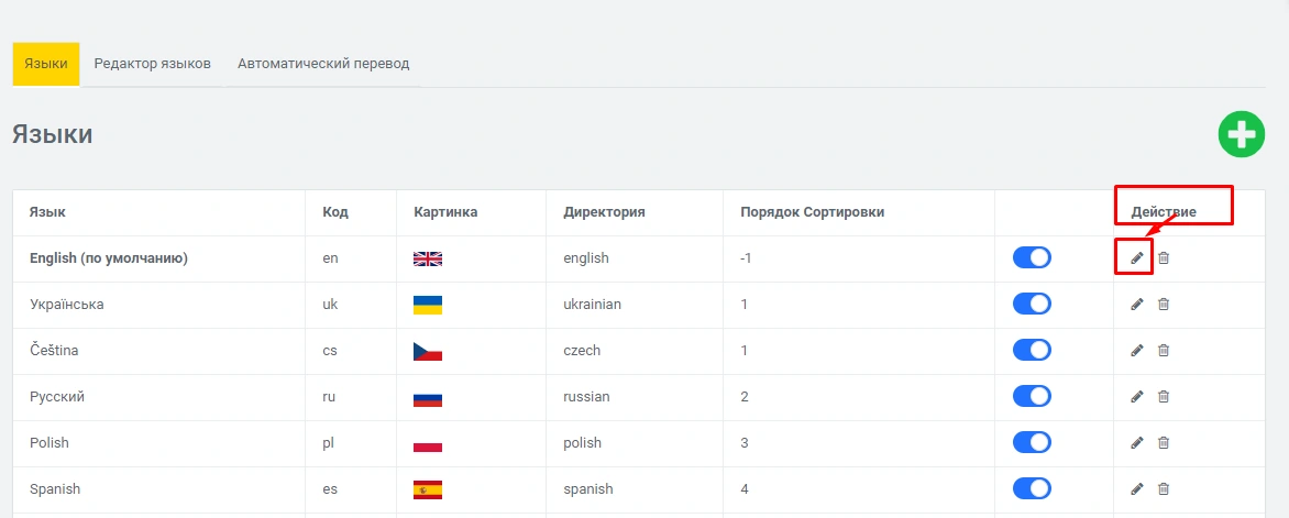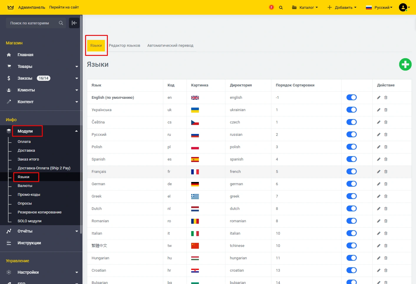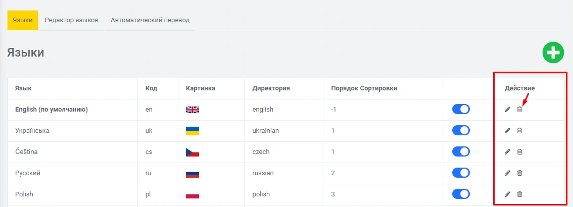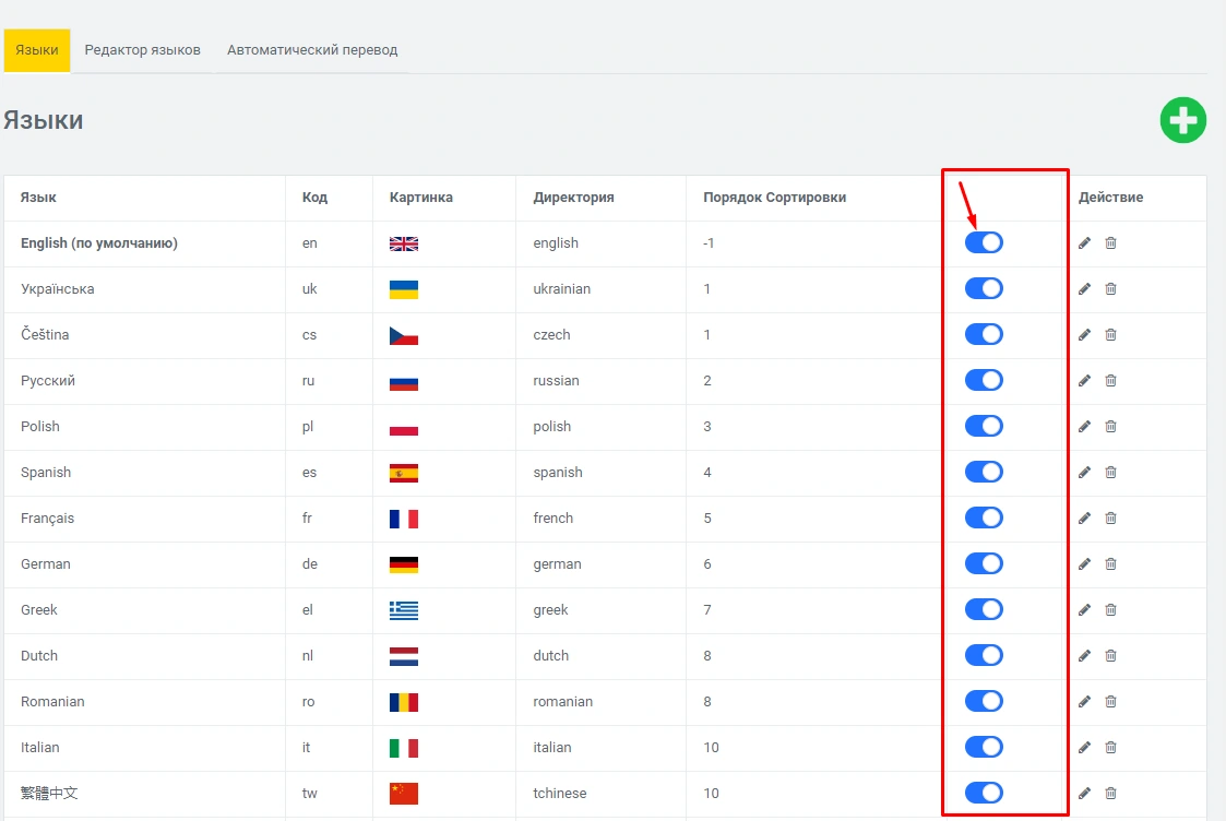По желанию можно включать/исключать языки – в колонке «статус» передвинув рычажок: