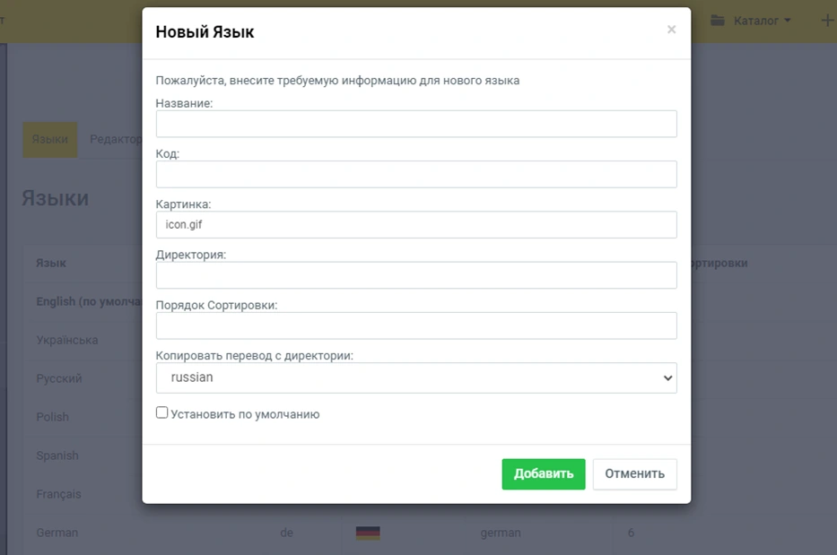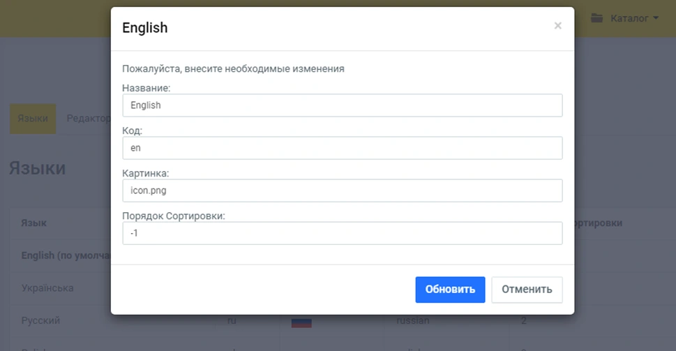 В панели администрирования -> Модули -> Языки -> вкладка «Языки»: