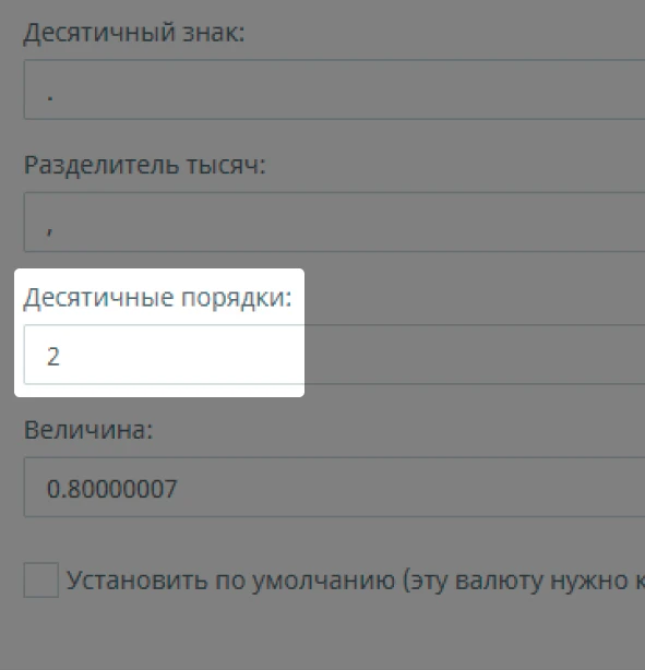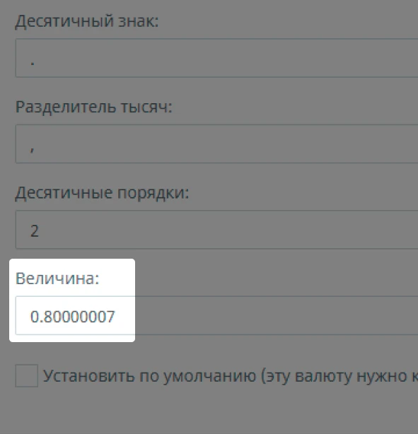 • Пункт "Величина" это курсовое соотношение между новой устанавливаемой валютой и валютой по умолчанию.