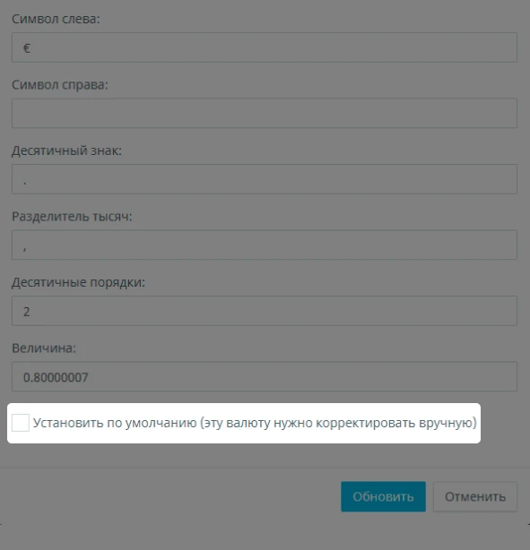 • Чтобы сделать валюту основной, напротив надписи "Установить по умолчанию", ставим "галочку"