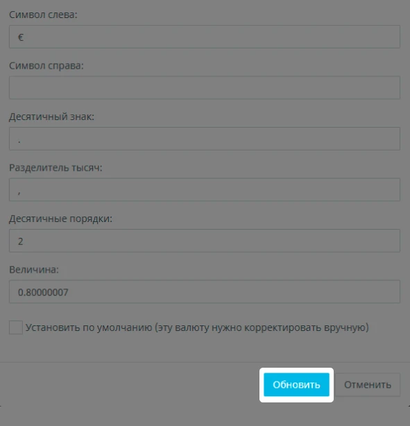 Например, у нас валюта по умолчанию "USD", а новая валюта "EUR", курсовое соотношение между этими валютами такое: $1 = €0.80, поэтому в графе "Величина" мы записываем 0.80.