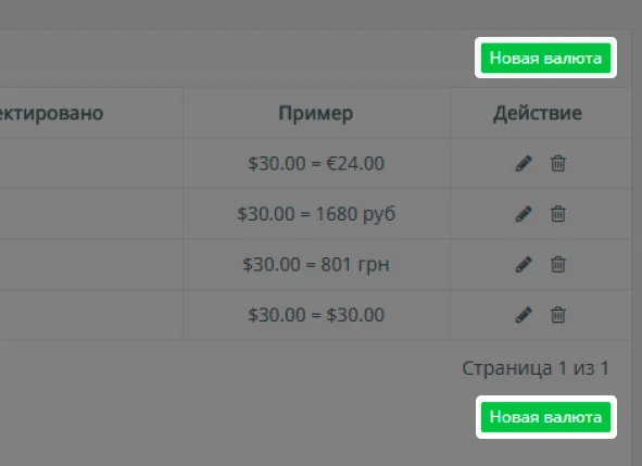 Для того, чтобы добавить новую валюту необходимо пройти "Модули / Валюты" и нажать "Новая валюта" (на одну из кнопок, вверху или внизу).