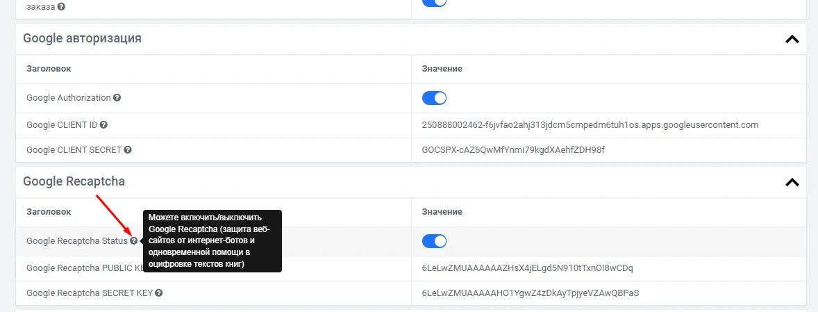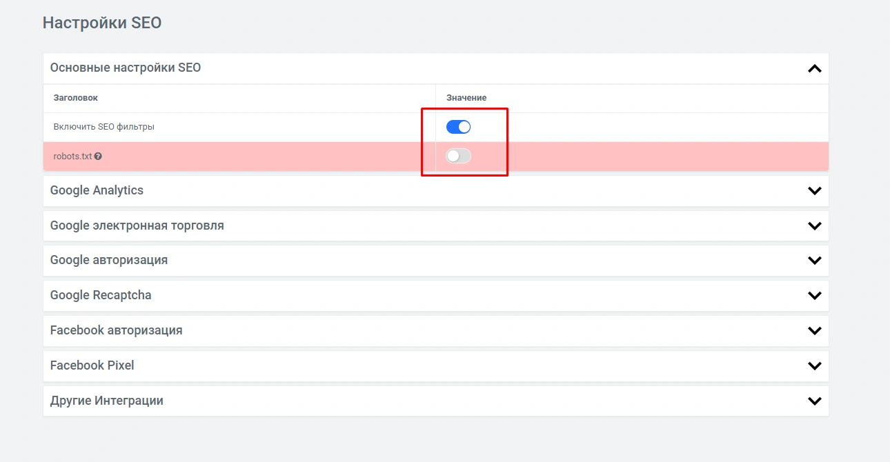 Здесь у Вас есть возможность включить/выключить статус для настроек SEO, нажав при этом рычажок кнопки статуса: