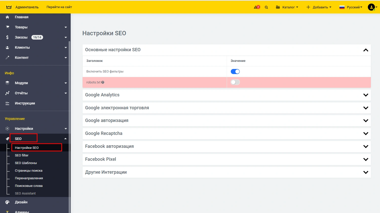 Команда Solomono разработала удобный функционал для работы с настройками SEO. Для этого, перейдите в панель администрирования раздел SEO -> Настройки SEO: