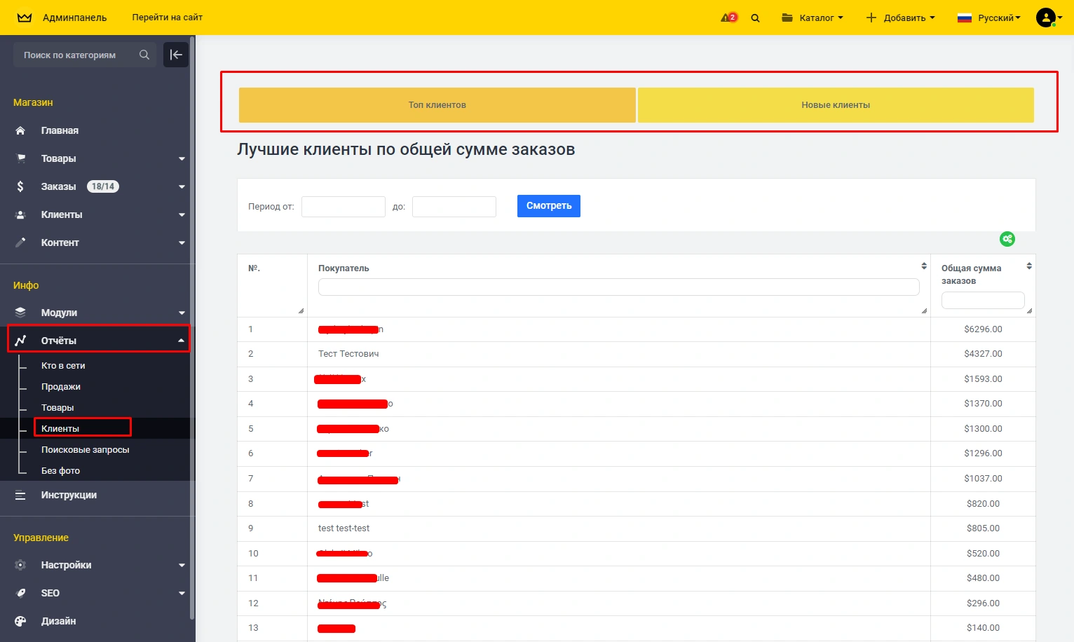 По данному отчету Вы сможете выставить необходимый период действия, а в колонке "Общая сумма заказов" для анализа, выбрать клиентов с самыми большими или наименьшими сумами заказов, также в колонках отчета присутствует фильтр от большего к меньшему и наоборот"стрелочки вверх/вниз", для более удобного просмотра данных: