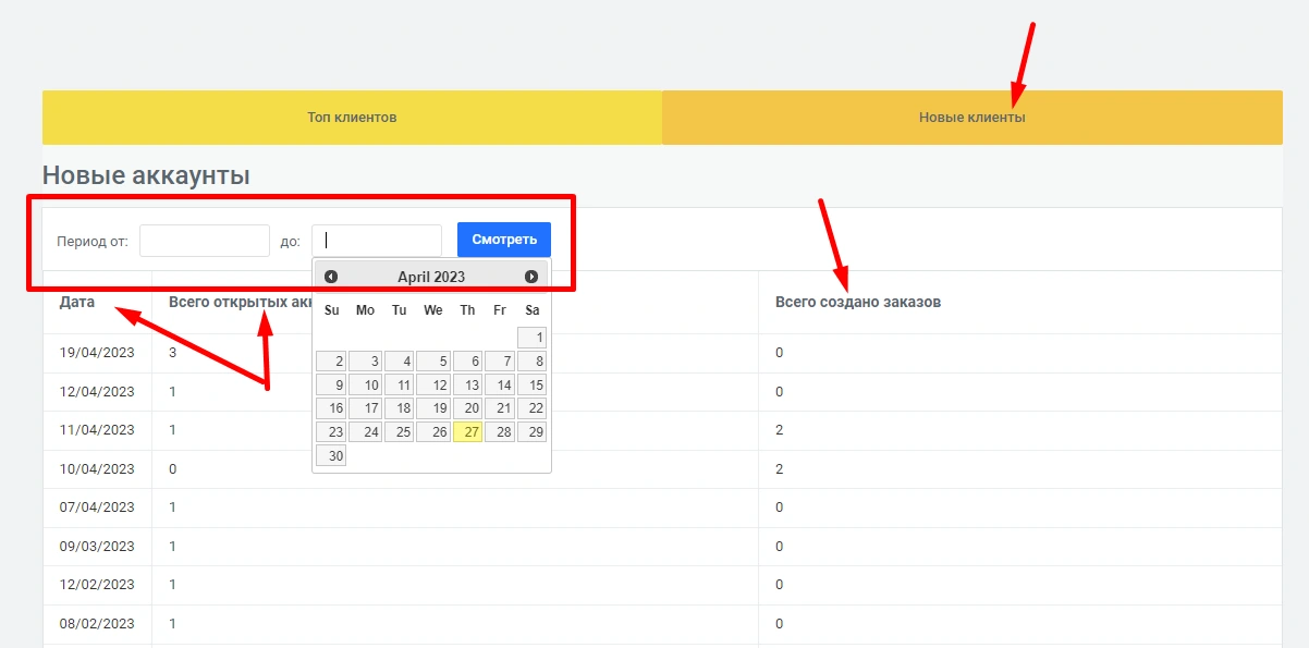 По этому отчету, для анализа, Вы сможете также выставить необходимый период действия, а также, и по определенной дате, сколько, например, в этот день было зарегистрировано новых аккаунтов и создано из них заказов: