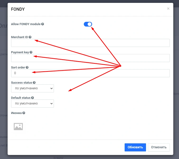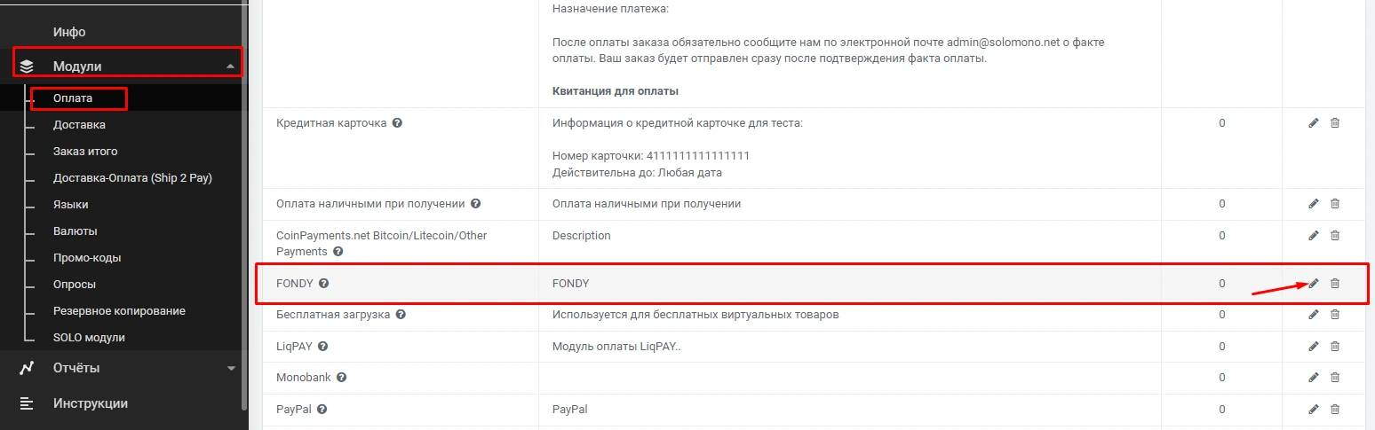 Для того что бы настроить модуль оплаты, перейдите в панель администрирования «Модули» -> «Оплата» -> «FONDY» если он у Вас не активный нажмите на иконку "+"