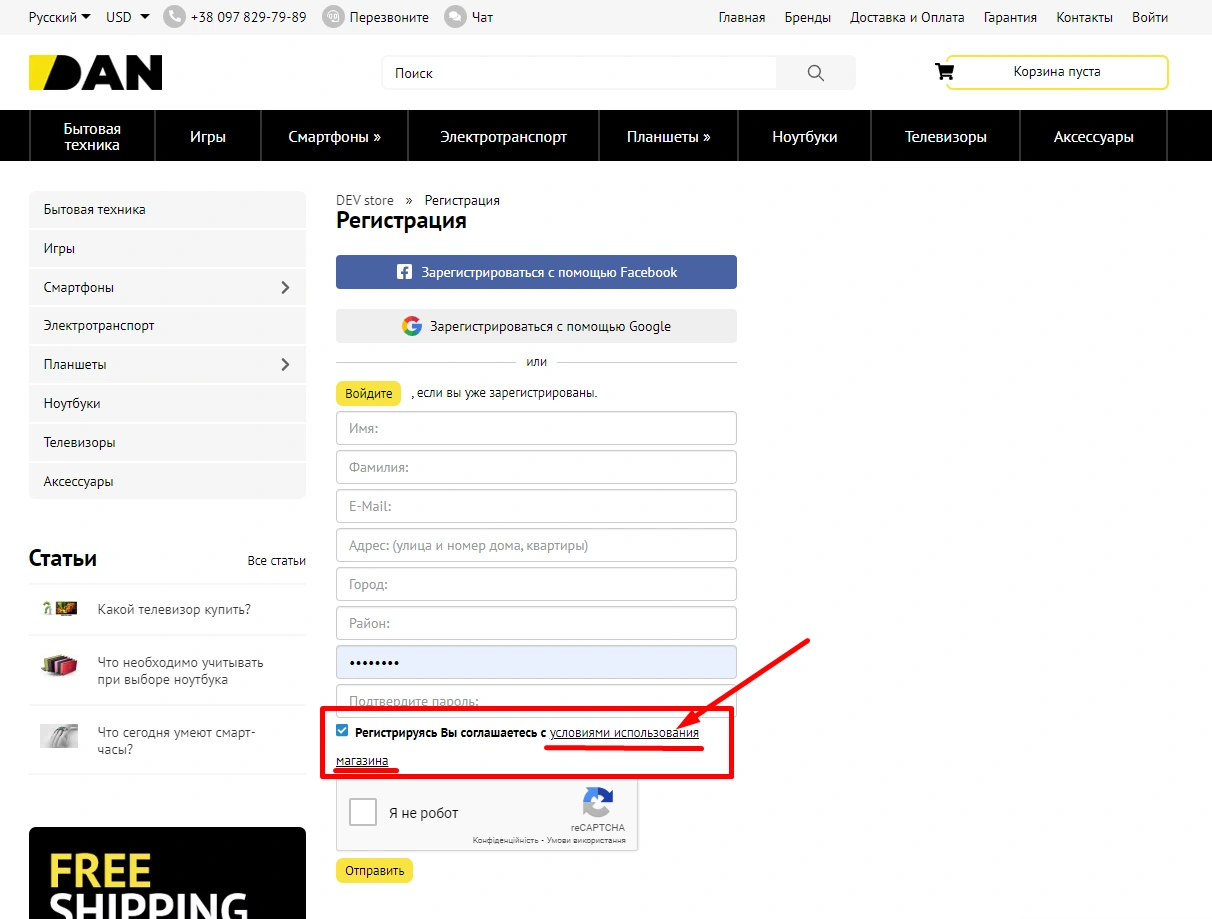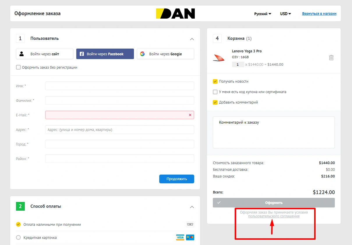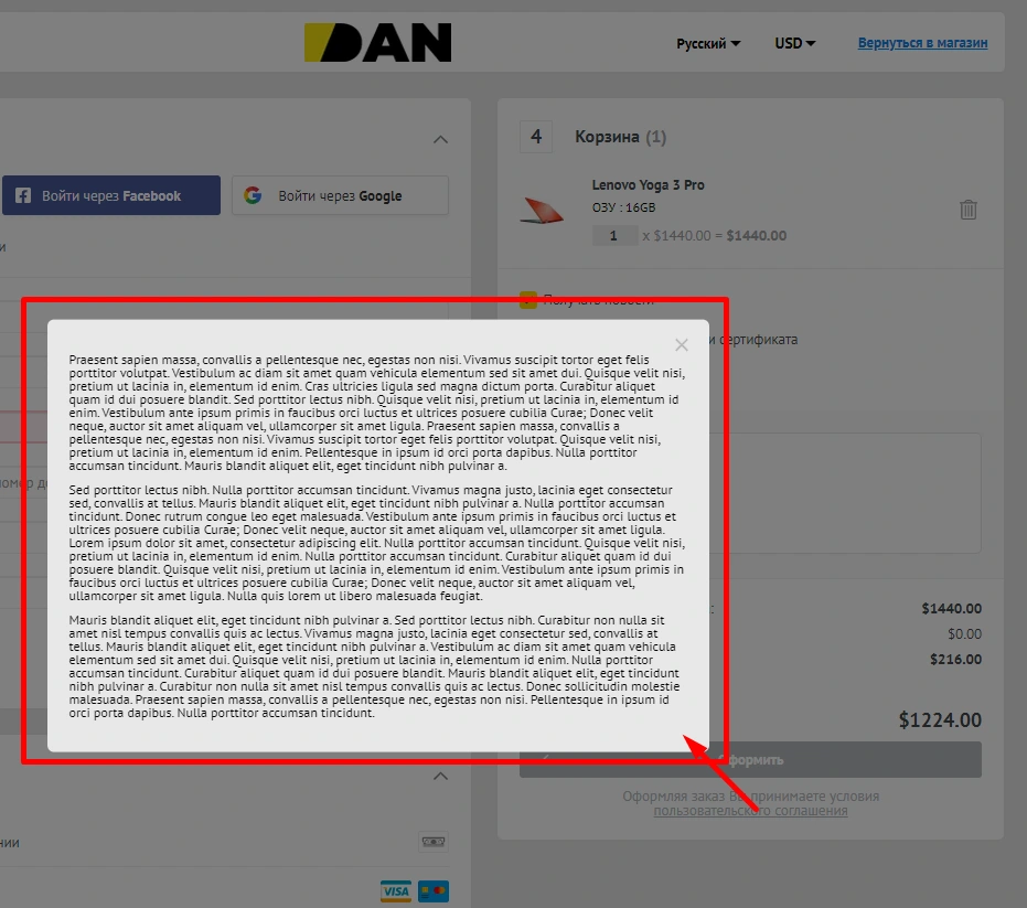 Также при оформлении заказа в форме при нажатии на текст, под кнопкой "оформить", размещен блок "пользовательского соглашения" по умолчанию: