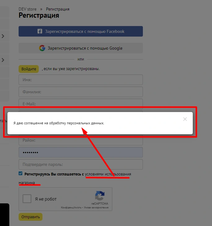 Согласие на обработку персональных данных совершаеться при регистрации пользователей на сайте, когда Вы нажимаете кнопку "Регистарция" после, переходите непосредственно на форму регистрации, где в строке после подтверждения пароля находиться иконка с галочкой "Регистрируясь Вы соглашаетесь с" где в фразе "условиями использования магазина"