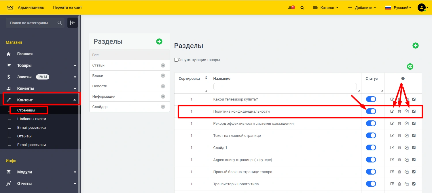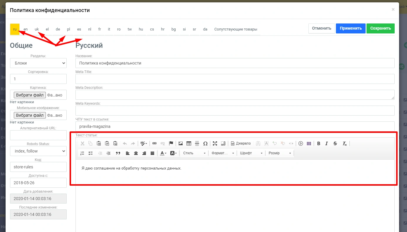 Управление указанным текстом производиться через панель администрирования: «Контент» -> «Страницы» -> «Политика конфиденциальности», при нажатии на иконку редактирования - Вы можете самостоятельно изменить текст.