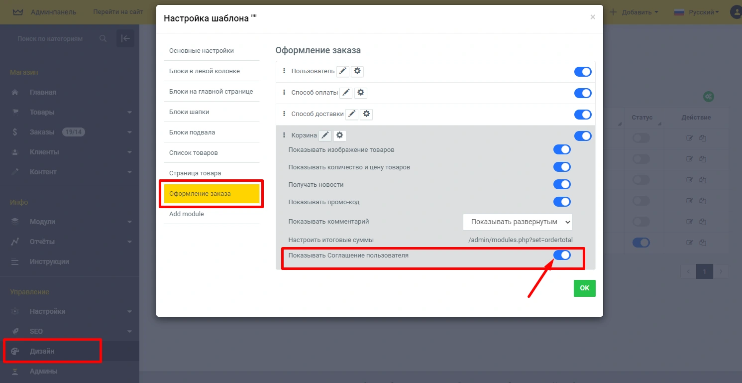 Управление выводом данного соглашения, производиться через панель администрирования -> «Дизайн» -> «Оформление заказа» -> «Показывать Соглашение пользователя»:
