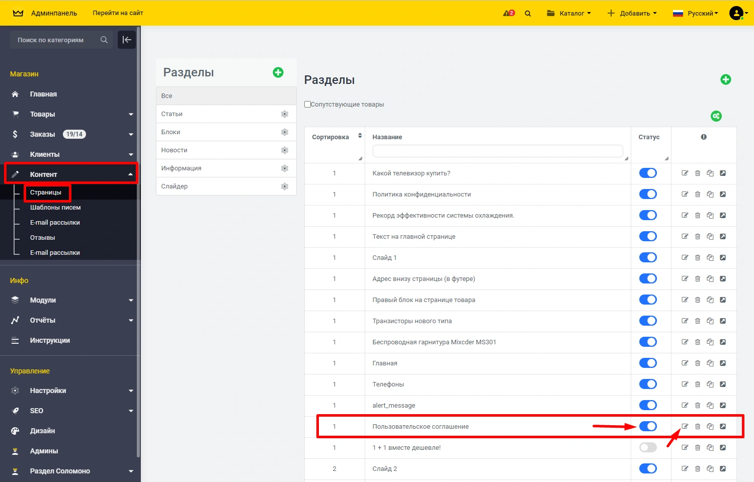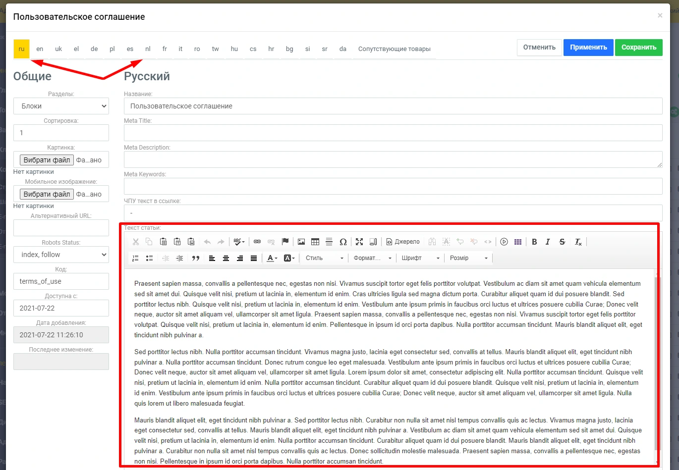 Текст которого, Вы можете коректировать через панель администрирования: «Контент» -> «Страницы» -> «Пользовательское соглашение»: