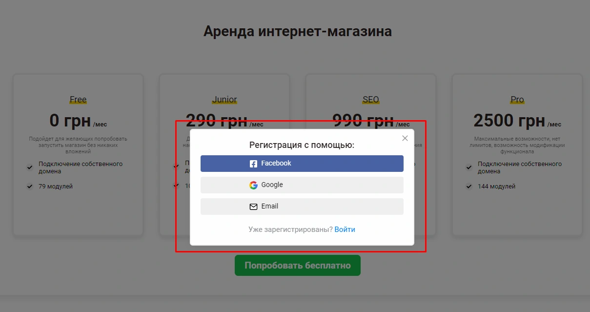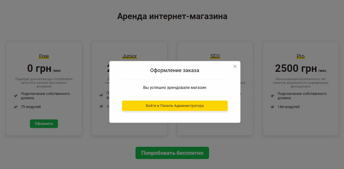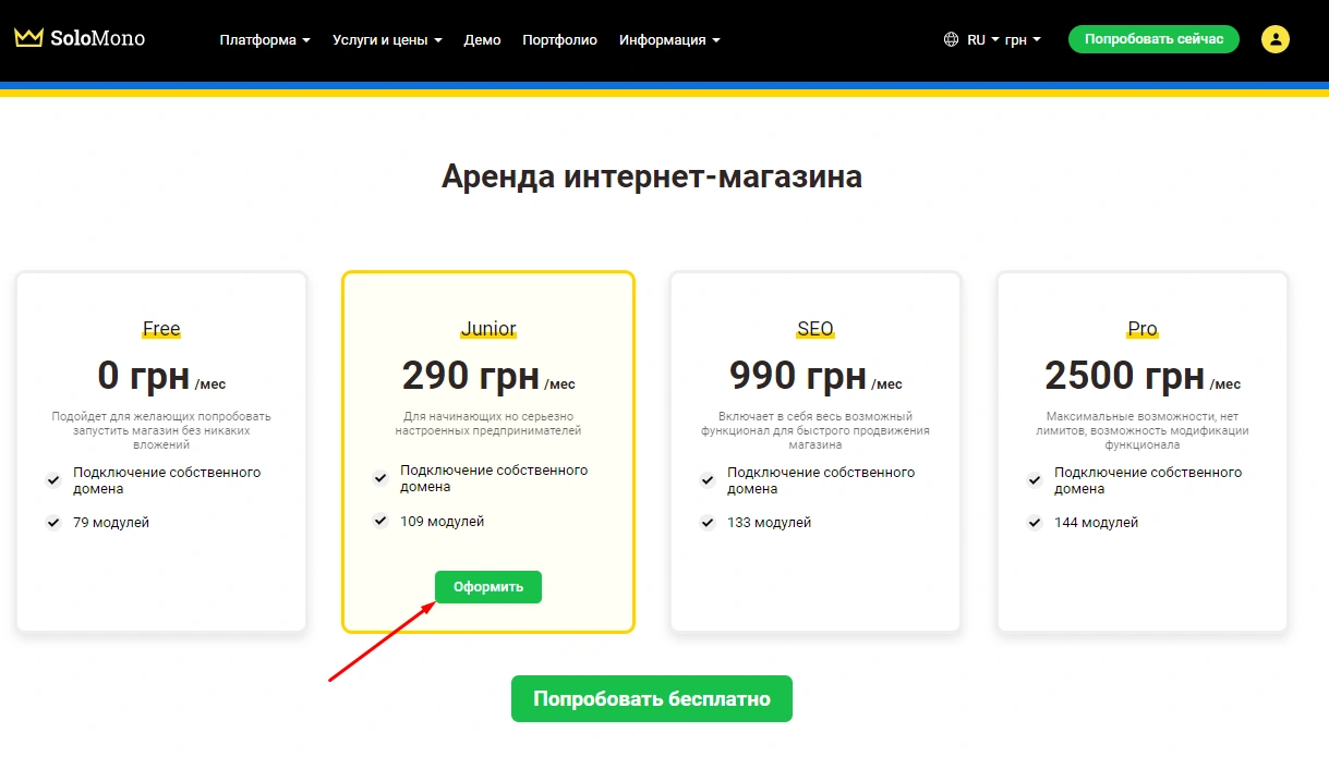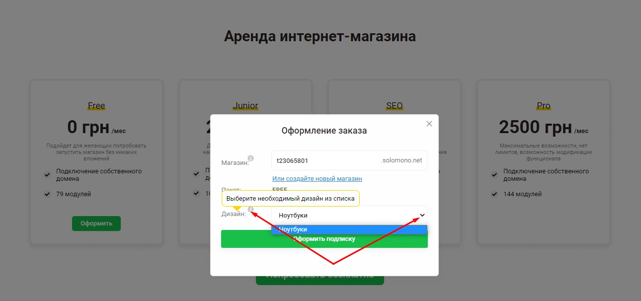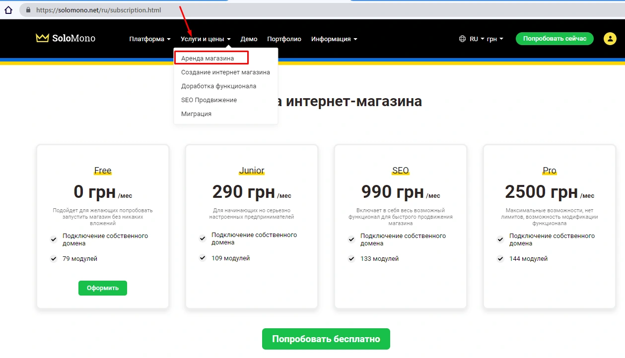 Чтобы арендовать сайт перейдите в https://solomono.net/ru/subscription.html: -> «Услуги и цены» -> «Аренда магазина»