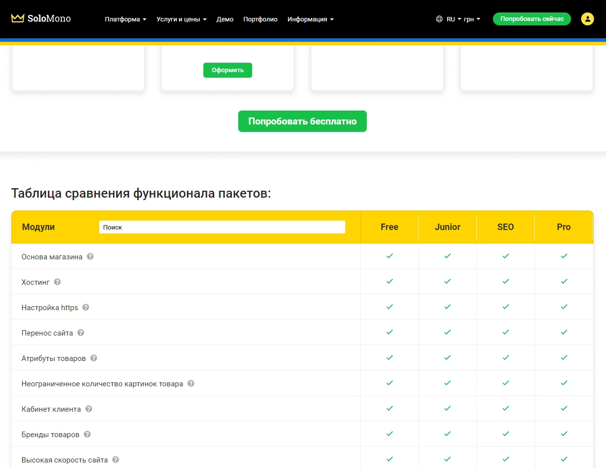 Также на этой странице (прокрутив вниз) Вы сможете просмотреть и сравнить список модулей входящих в выбранный Вами пакет