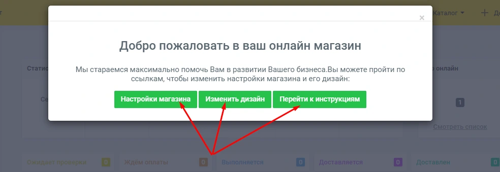 После нажатия "Вход в панель администрирования" у Вас будет предложение - Изменить дизайн, Перейти к инструкциям или перейти к настройке магазина