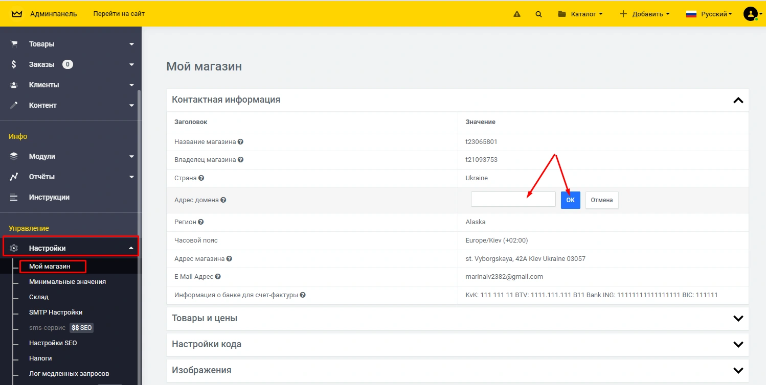 Можно сказать, что одним из самых главных этапов является "настройка магазина". Переходим в панели администрирования -> «Настройки» -> «Мой магазин»