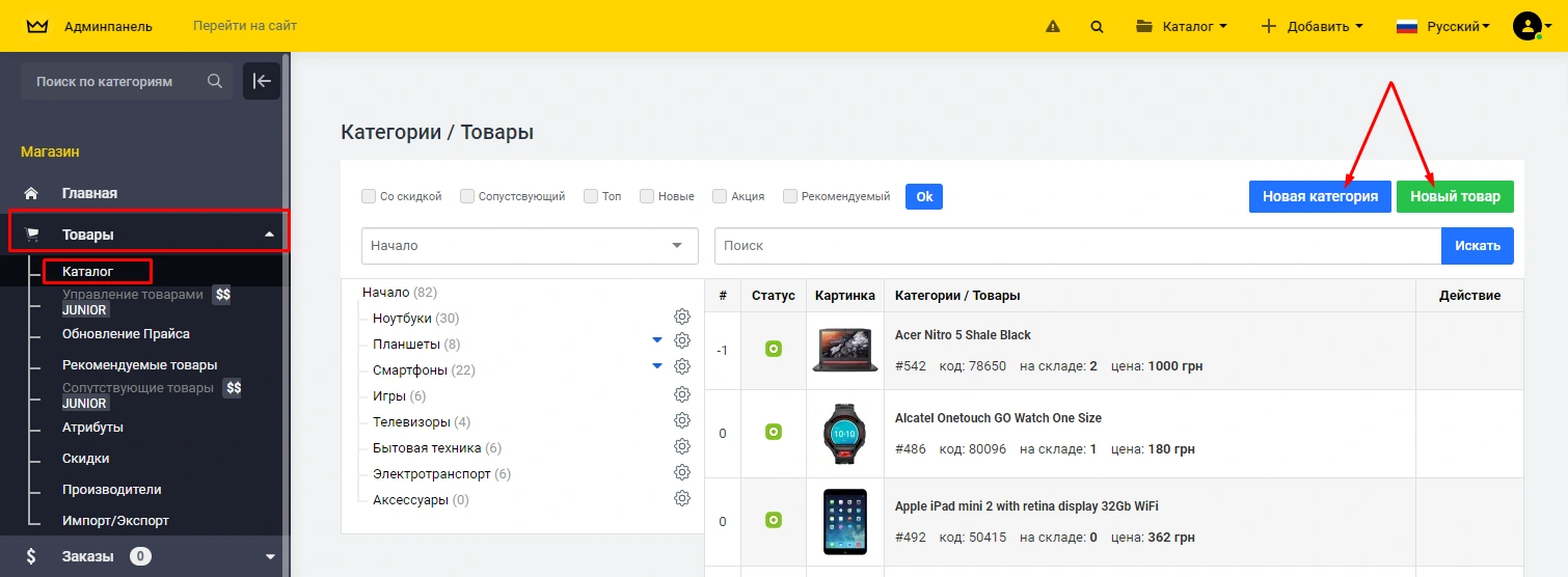 Вторым этапом Вы можете зайти в каталог товаров, добавить новые товары и категории. Для ознакомления с инструкцией по работе с категориями/товарами перейдите сюда: https://solomono.net/ru/stvorennja-ta-redaguvannja-tovariv-a-443.html