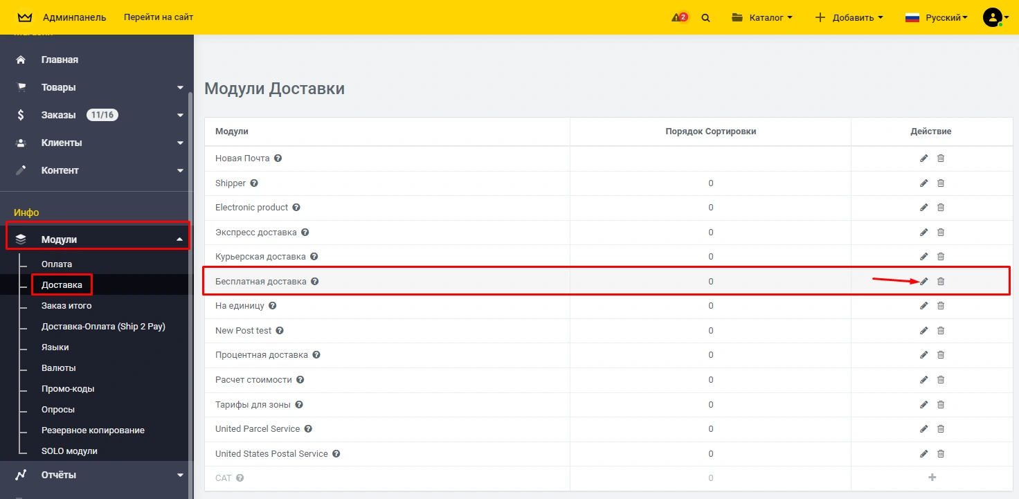 Для начала включите сам модуль, для этого в панели администрирования перейдите «Модули» -> «Доставка» -> «Бесплатная доставка» если он у Вас не активный нажмите на иконку "+"